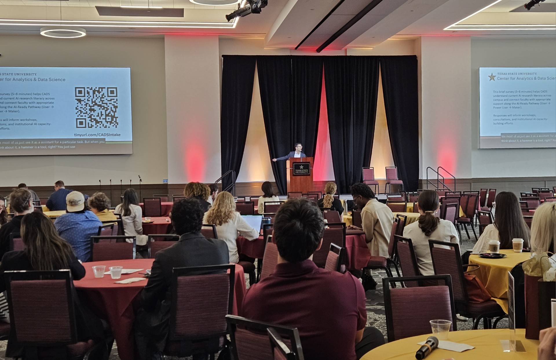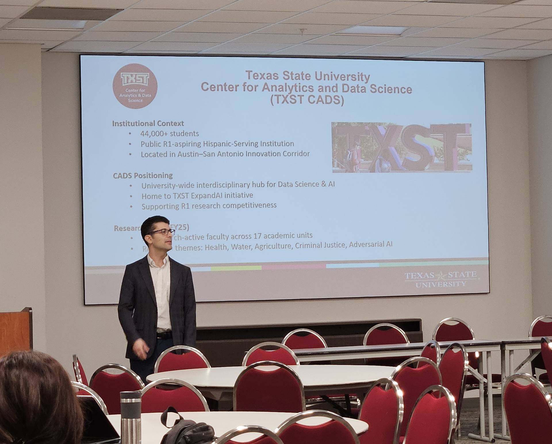 During both days, CADS staff and affiliated researchers engaged with attendees in sessions focused on AI‑guided research strategies, available TXST tools, and classroom integration. On day two, founding CADS Director Dr. Tahir Ekin offered welcoming remarks and emphasized the need to work with AI rather than against it as well as the responsibility to utilize the technology responsibly. Breakout sessions across the symposium showcased innovative approaches to course design, workplace applications, ethical considerations for generative AI, and strategies for aligning classroom learning with real‑world needs.
